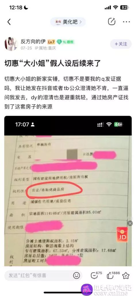 被锤之后,甚至还试图狡辩,给不明真相的粉丝曝出一张自己的房产证照片,然后又被锤爆,实际连这个房产证都是偷来的,自己的房子实际就是民宿