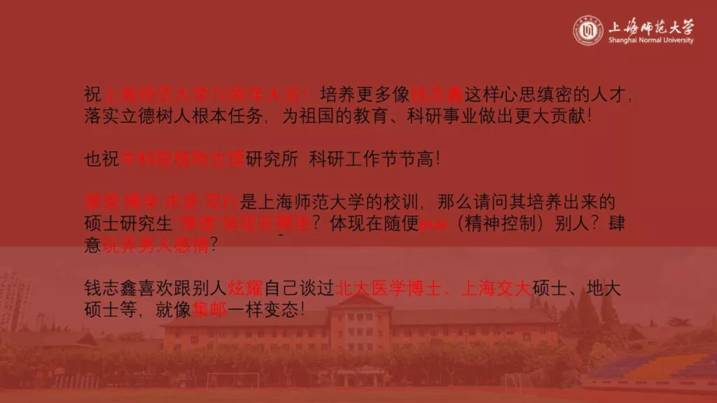 又是一位PUA大师与学术骗子的结合——上海师范大学的【钱志鑫】在恋爱期间不仅脚踏两只船,还涉及学术造假,撰写虚假论文,私生活不堪,长期对男主进行Cao控。在男主揭露真相后,他愤怒地制作了23页PPT,详细曝光了前女友的种种不端行为。