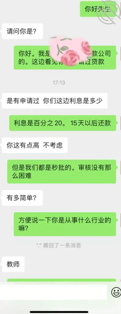 随后便是加上了我的小号开始聊天,我的小号也表示你的征信最近太花了,负债短时间内升高太多,很难有正规合法的路子能批下来了弟妹就像溺水的人,眼见最后一根浮木都要飘走,正当绝望之时我的小号及时的添补上了一句。