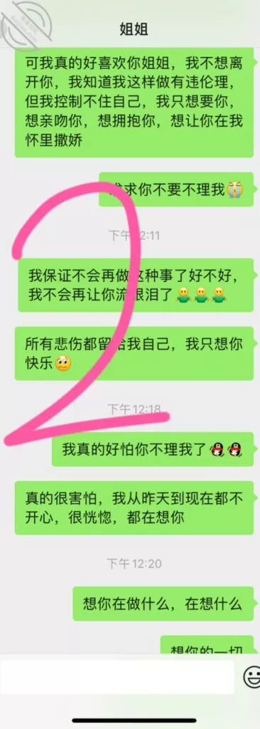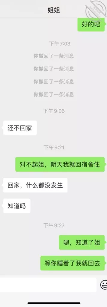 一下午姐姐也没给我发条消息,我就试着发了几条消息给她,但都撤回了,想看看她的反应,后面因为我一直没回家,姐姐终于给我发消息了,我一时羞愧尽然说了要搬走的傻话,真想给自己一巴掌,发完这个帖子就回家,总该要面对该面对的