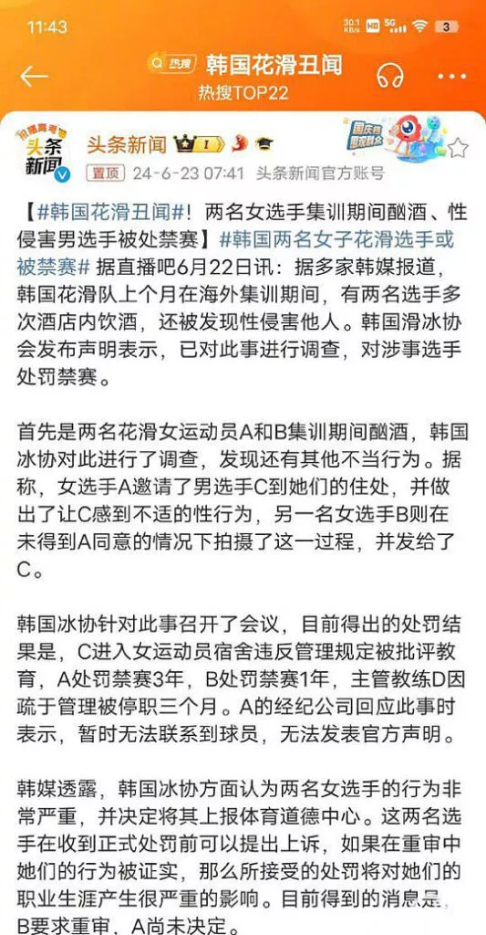 韩国花样滑冰国家队爆发丑闻!19岁花滑女神李海仁涉嫌QJ16岁男队友,并让闺蜜旁观拍摄,事件引发广泛关注。据报道,事件涉及李海仁、20岁的刘永和16岁的徐玟圭,他们是韩国花滑的佼佼者,曾在四大洲花滑大奖赛上获得女子单人银牌,徐玟圭还在世青赛中夺得男单冠军,代表着韩国花滑的未来。