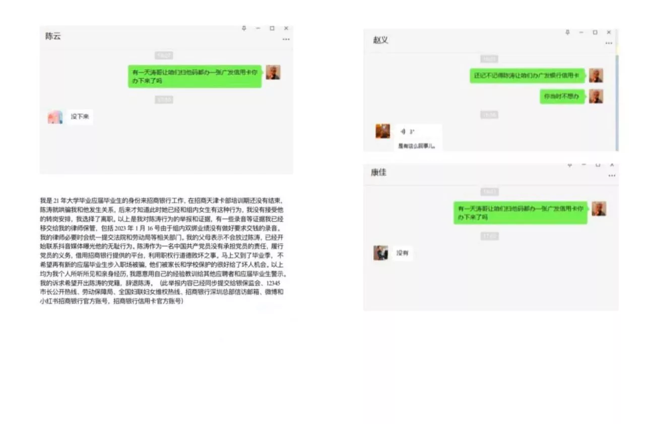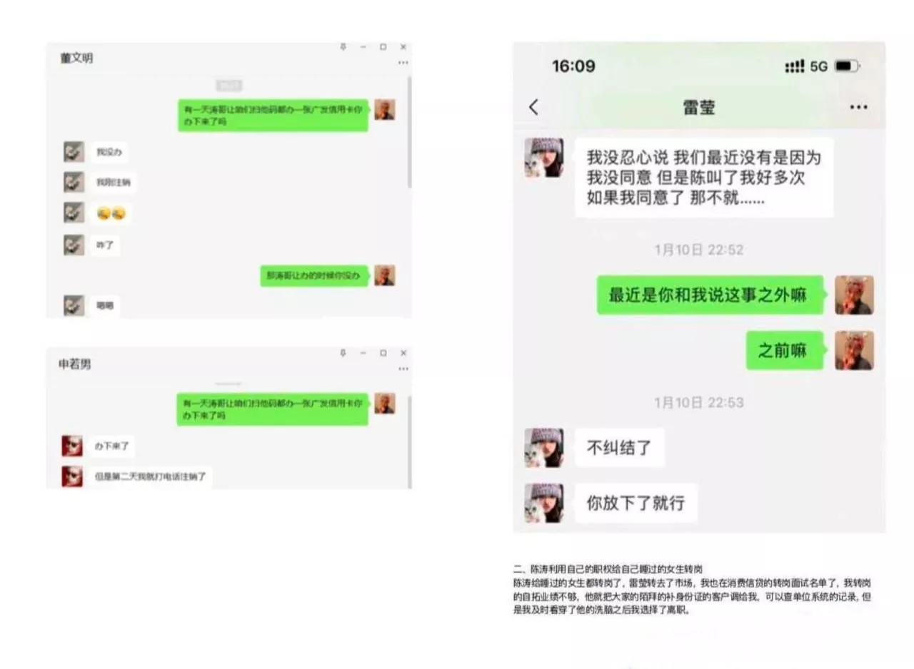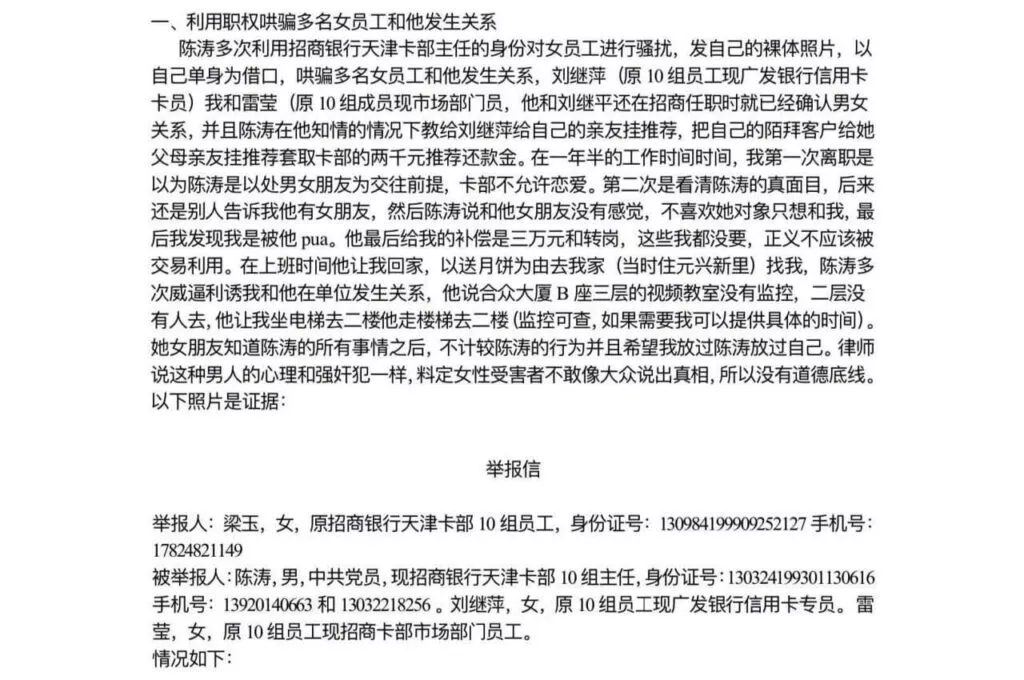 招商银行天津卡部10组员工梁玉实名举报部门主陈涛潜规则女下属