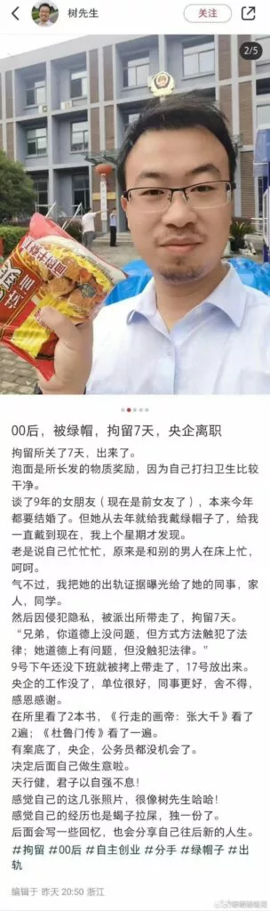 一位24岁的男子社交平台昵称00年的树先生辛苦经营了9年的感情,从高一恋爱到结婚,却遭遇了妻子的出轨。更令人痛心的是,他因公开相关隐私而被拘留7天,并被迫离开了央企。然而,那位年轻的出轨妻子与她的40岁情人似乎并未受到任何影响。这一事件听上去实在令人心痛。