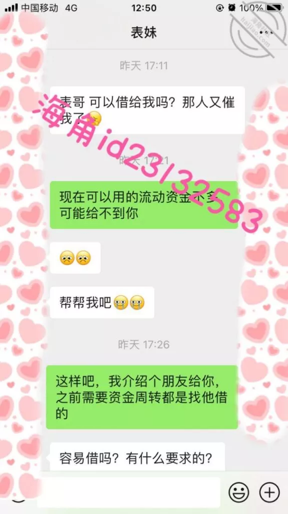 表妹还了最后的钱后,前几天又找我小号想借钱,原来之前欠的一万块她自己找朋友借钱还了,现在应该没办法又要找我借。