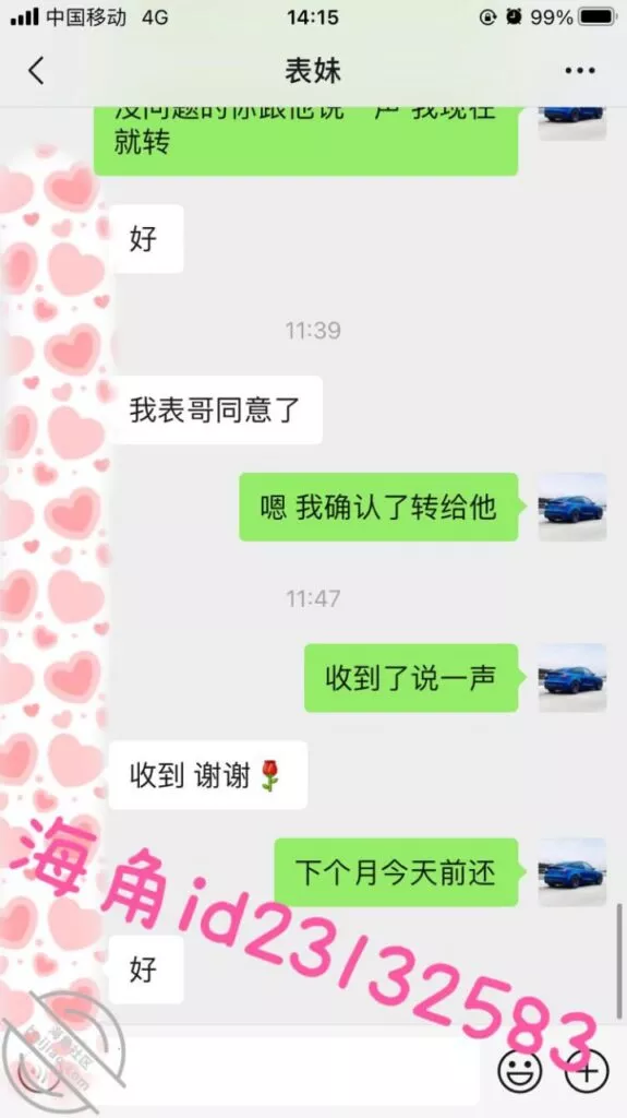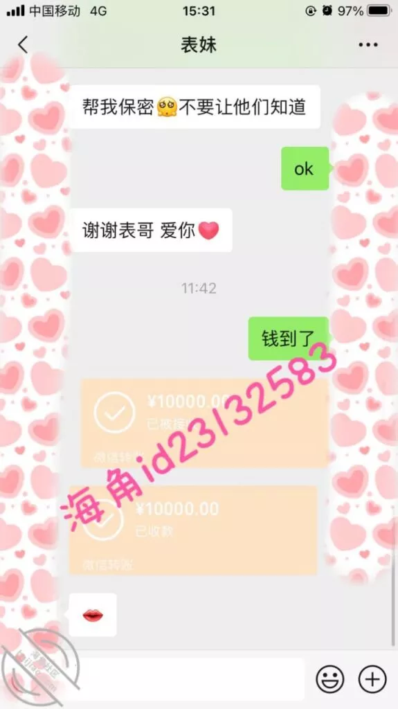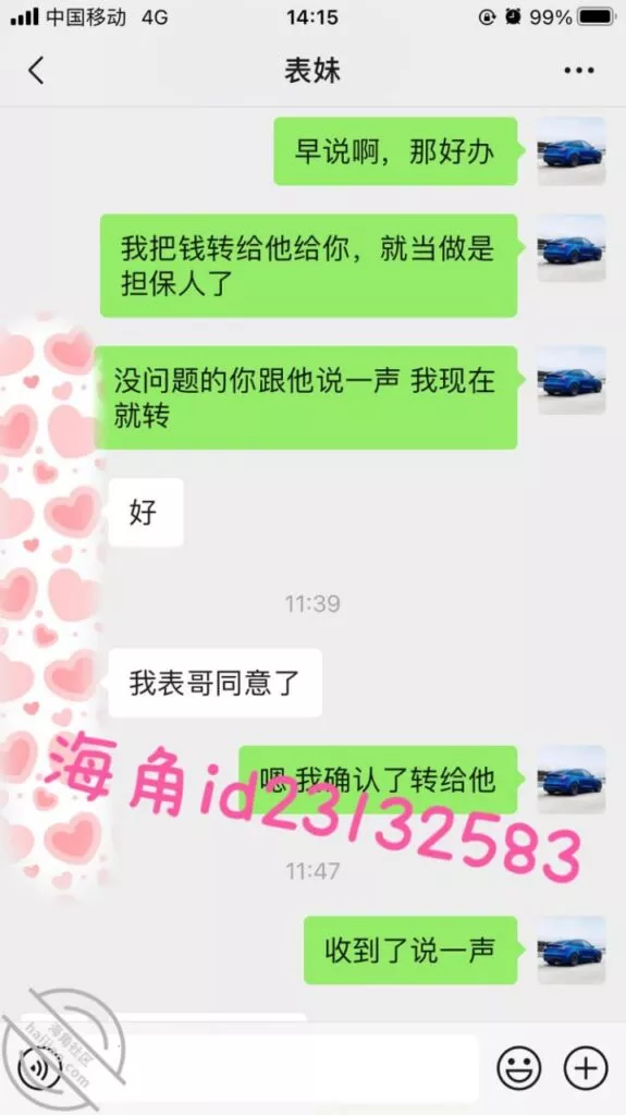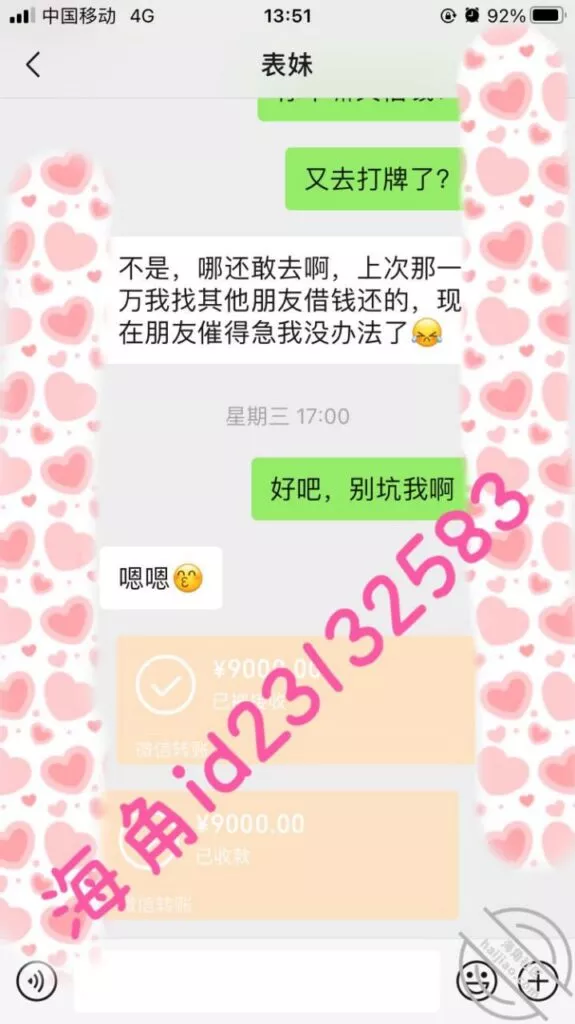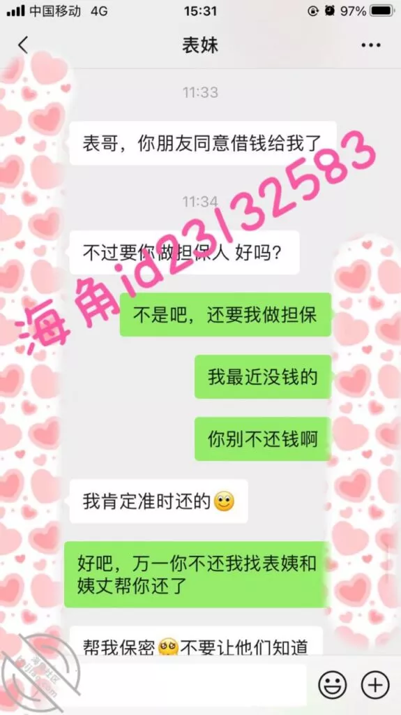 这次我故意说要一个月还,让她短时间内很难再找其他人借,视频不强求她拍了,用我大号表哥的身份作担保来转钱给她,不然她容易怀疑,两次都是不直接转给她…