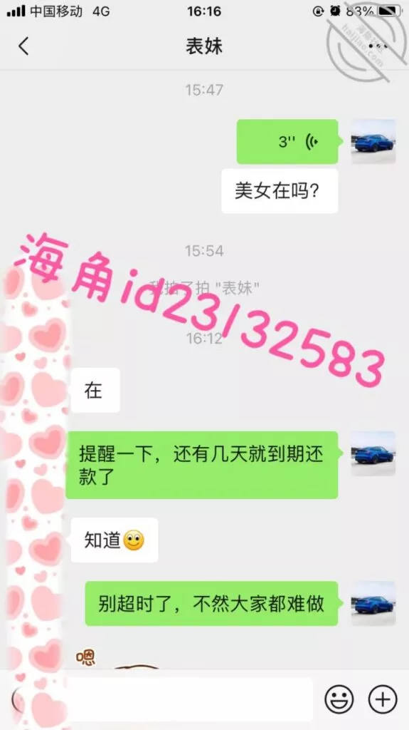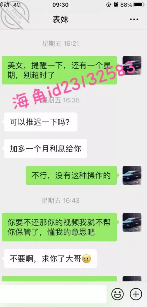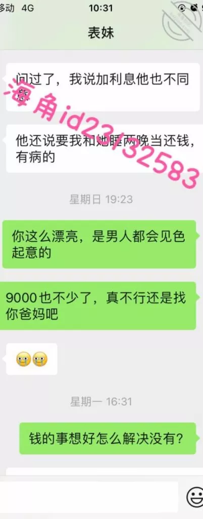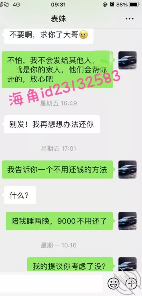 上周五用小号提醒表妹准时还款,果然她要还不上了,先吓一下她要发视频给家人,然后说9000陪我睡两晚,她就不理我了。