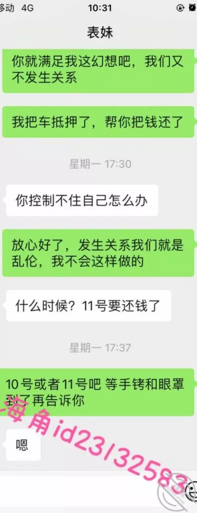 昨天突然找我借钱,看海角很长时间了,很想试试错乱关系的滋味,况且表妹是个美女,我说这两天给她答复。