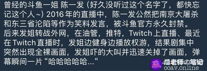 曾经的斗鱼一节陈一发因直播时涉及不当言论被中国地区全网封杀,转战外网直播,而在近日的一场直播中,发姐一边健身一边看权游电视剧,结果电视剧尺度太大,出现全果镜头,吓得发姐一顿手忙脚乱差点把最后的后路也断掉。