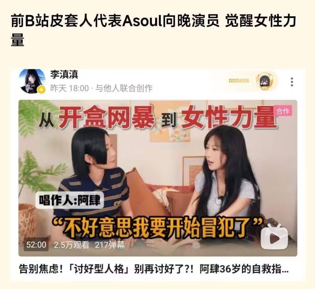 事件发生后,asoul向晚便被雪藏,李奕在脱离虚拟偶像团体后,改名李滇滇在b站重新出道,却第一时间背刺粉丝,首先要做的是觉醒女性力量