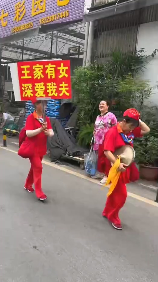 重庆一名男子被妻子当场发现与第三者有染。愤怒的妻子在街头将第三者拉出示众,沿街游行,还请来一支老年乐队,举着标语牌一路助威。