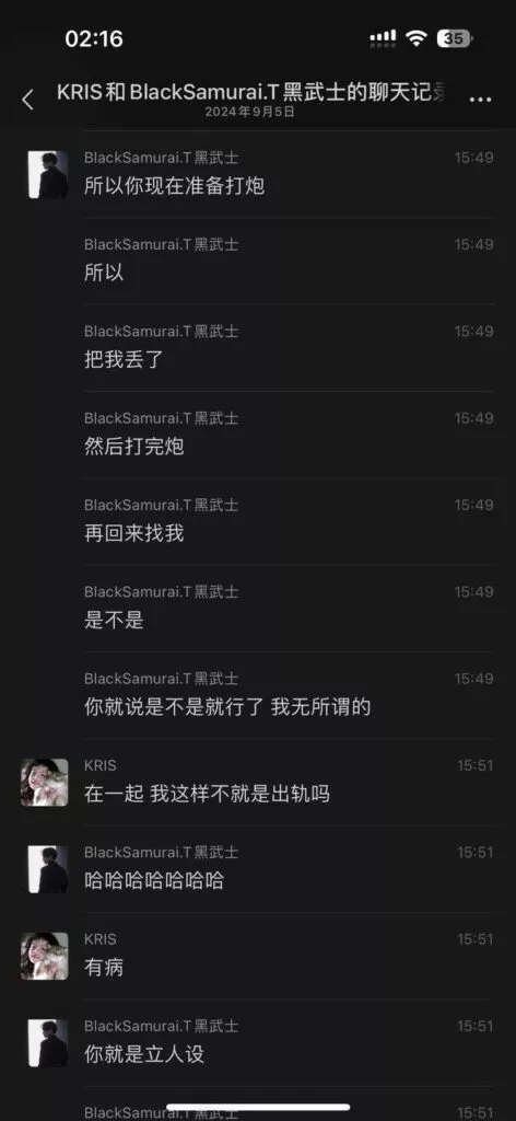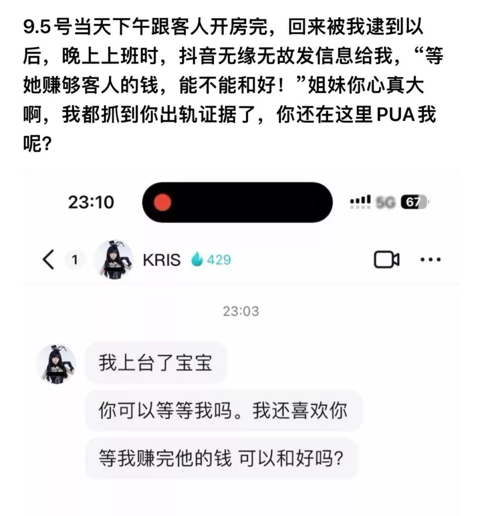 广州女DJ李佳焰(Kris)与男友相恋两年,却屡次出现出轨行为。她不仅与其他男性约会,还受到PUA(把妹达人)的影响,背着男友与剧本杀的老板发生关系。更令人震惊的是,她甚至在包厢中与陌生男子私通,事后还将对方带回家继续亲密接触。这一系列行为让人感到震惊和失望。
